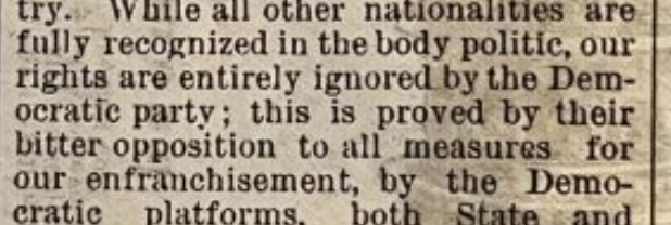 WHEREAS, In view of the coming election, and the importance of its far reaching influence for good or evil, we feel it a duty that we owe to ourselves, to support only such men and measures as will protect us in our civil and political rights. Since acquiring our political rights, we feel from the force of circumstances, as though we stood in a peculiar position, as between the two great political parties of the country. While all other nationalities are fully recognized in the body politic, our rights are entirely ignored by the Democratic party; this is proved by their bitter opposition to all measures for our enfranchisement, by the Democratic platforms, both State and National, and the voice of its press throughout the country, the recent combinations of that party throughout the South, and quietly acquiesced in by the same party North, to deprive the colored men in this country of their political rights at all hazzards.